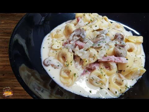 La primera es Pasta alla Regla, un plato menos popular de lo que se merece. Terminamos con una receta simple y exquisita,Espaguetis con champiñones y bacon, un exitación como otro alguno. Ahora tenemos la pasta lista, sacamos del fuego, laescurrimos y agregamos a la sarténdonde tenemos la salsa. En un caso así utilizamos pasta ahora lista, esto es los tortellinis ahora los disponemos preparados solo hay que cocerlos. Ya que en el tiempo que tardan en cocerse podemos preparar la salsa que los va a acompañar. Cuando esté la salsa, que debe de quedar un tanto ligera , si hiciese falta añadimos considerablemente más leche, agregamos el queso rallado, removemos hasta el día de hoy en que se funda todo el queso.